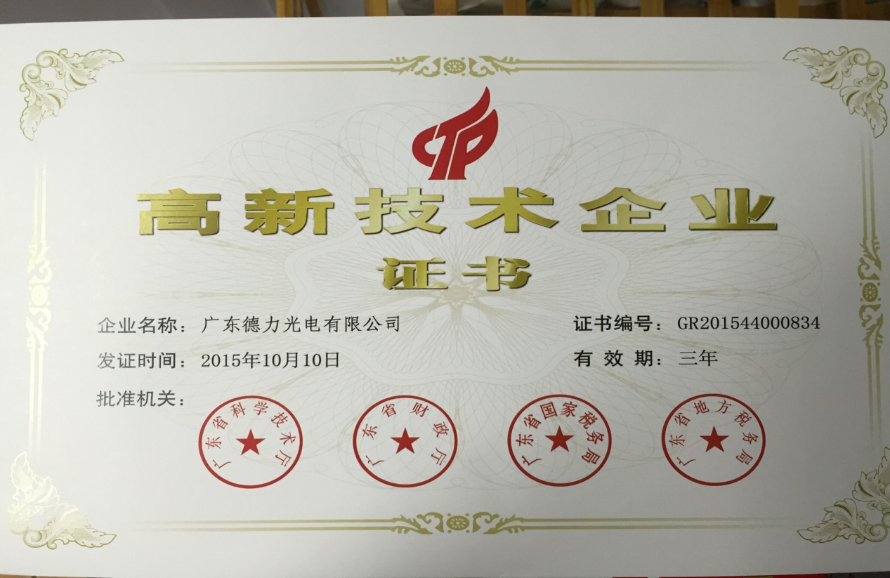 2016年3月25日德力光電收到廣東省科學(xué)技術(shù)廳、廣東省財(cái)政廳、廣東省國(guó)家稅務(wù)局、廣東省地方稅務(wù)局聯(lián)合頒發(fā)的《高新技術(shù)企業(yè)證書(shū)》。這是對(duì)德力光電科研成果及技術(shù)創(chuàng)新的認(rèn)可,是企業(yè)科技實(shí)力及持續(xù)創(chuàng)新能力的證明。